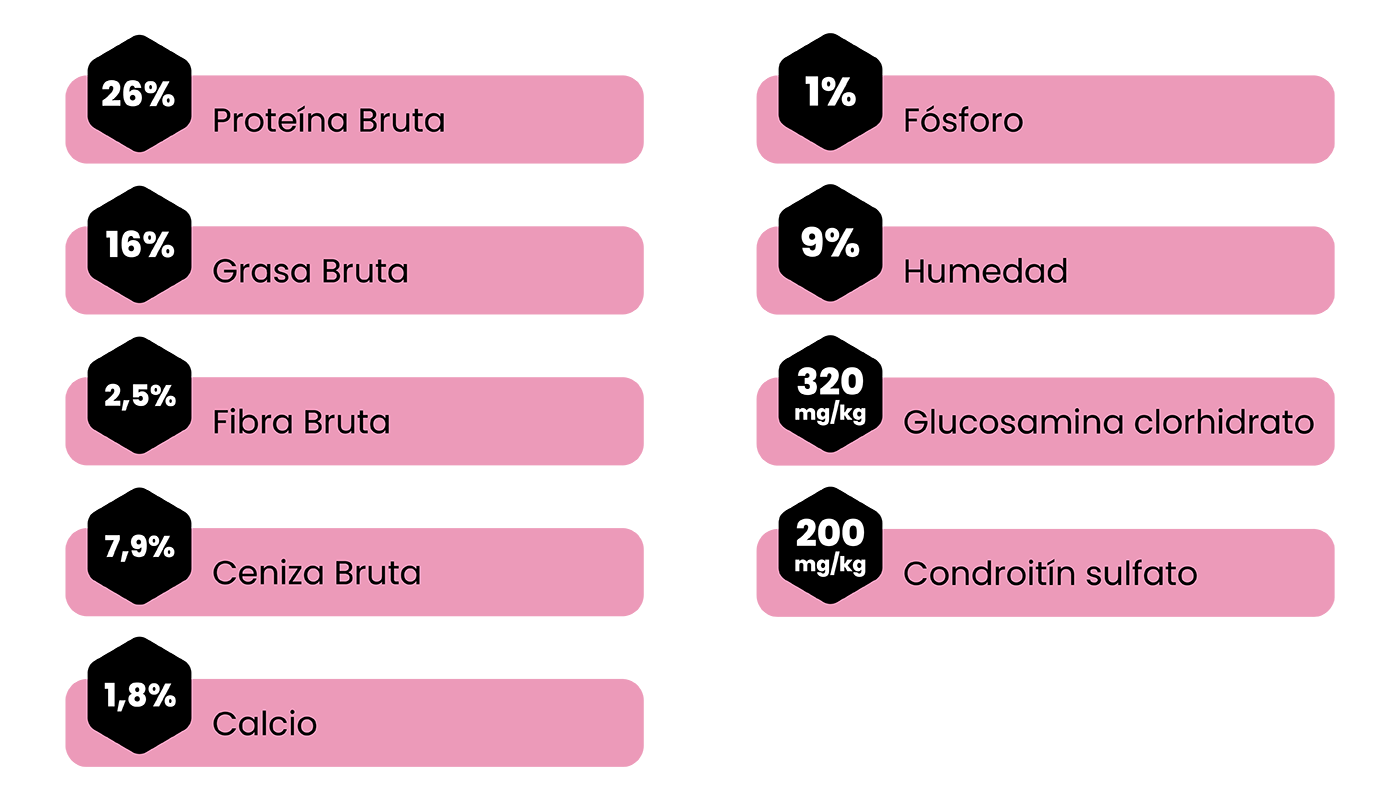Carne deshidratada 36 % (pollo 14 %), arroz 27 % (arroz integral 15 %), guisantes 12 %, grasa de ave 12 %, harina de algarroba 2 %, pulpa de remolacha 2 %, proteína animal hidrolizada, vitaminas y minerales, levadura y extracto de levadura-Saccharomyces cerevisiae (fuente de mananooligosacáridos – MOS y β-glucanos), aceite de salmón (fuente de ácidos grasos omega-3), fibra dietética insoluble de guisante, inulina (fibra soluble de achicoria, fuente fosfooligosacáridos - FOS), salvia hispánica (fuente de ácidos grasos omega-3 y fibra dietética), algas (Ascophyllum nodosum), hidrolizado de crustáceos (fuente de glucosamina), hidrolizado de cartílago (fuente de Condroitina), aceites esenciales (orégano, canela, clavo, tomillo, romero, hierbabuena, té verde), yucca.