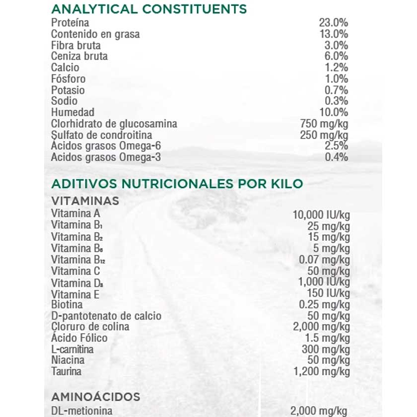 Pollo (14%), harina de pollo, arroz integral (14%), cebada, sorgo, copos de avena, salvado de arroz, levaduras deshidratadas, grasa de pollo (conservada con mezcla de tocoferoles), pulpa de remolacha deshidratada, aroma natural, semillas de lino, cloruro de sodio, cloruro de potasio, glucosamina, raíces de achicoria deshidratadas, col rizada, semillas de chía, calabaza, arándanos, naranjas, quinoa, algas deshidratadas, coco, espinacas, zanahorias, papaya, extracto de Yucca schidigera, sulfato de condroitina.